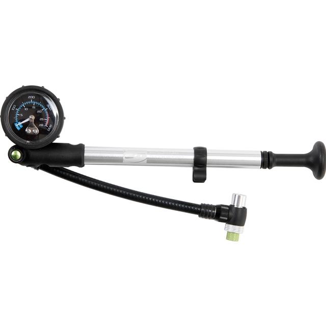 Dämpferpumpe "ShockRocket" 1.5" Präzisionsmanometer (bar/psi) mit stoßabsorbierender Kunststoffummantelung, geringes Packmaß durch 360° rotierbaren Schlauch, sensibles Feintuning: Druckregulierung durch Luftablass-Knopf, kein Druckverlust durch 2-Stufen Ventil.