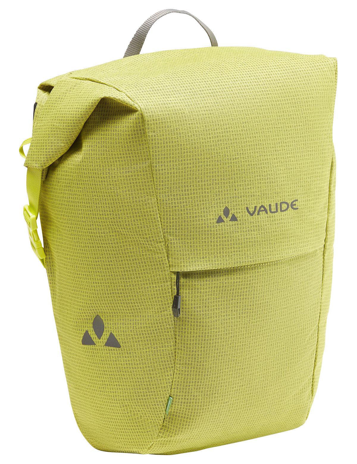 Flexibles Multitalent mit dem Plus an Sichtbarkeit! Die stark reflektierende Road Master Roll-It Hinterradtasche überzeugt mit ihrem unkomplizierten Rollverschluss. Sie lässt sich mit dem QMR 2.0 Befestigungssystem schnell und unkompliziert auf Gepäckträgern bis 16 mm Durchmesser fixieren. Ein Zug am die beiden Haken verbindenden Band öffnet das System. Die Raumaufteilung in ein geräumiges Hauptfach und ein kleineres Reißverschluss-Frontfach für Wertsachen eignet sich ideal, um Arbeitsunterlagen für Büro oder Uni unterzubringen. Am Zielort angekommen wird die Tasche bequem am längenverstellbaren Schultergurt getragen. Durch die flexible Rückenplatte und die im Lieferumfang enthaltene Regenhülle ist die Radtasche klein verstaubar und schnell einsatzbereit für kleine oder große Radabenteuer bei jedem Wetter. Die Road Master Roll-It Luminum wird nach VAUDE Green Shape-Kriterien aus recyceltem Polyester hergestellt. Lieferumfang: 1 Tasche